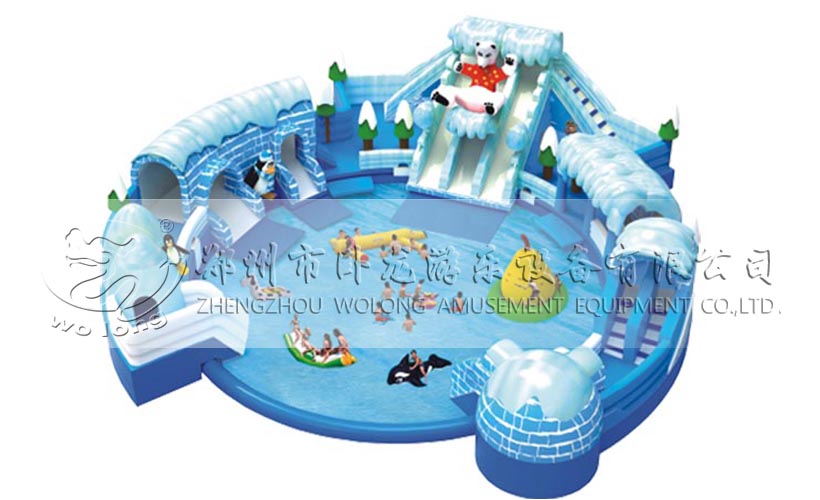 冰雪世界充气水滑梯,以冰雪世界为主题,人在冰天雪地中穿梭,从而达到人景合一的境界;该款产品配有多个不同的滑梯。充气水乐园中配有一个充气水池,水池中放些水上浮具,如香蕉船、水狗、冰山等,让现场的玩法丰富。