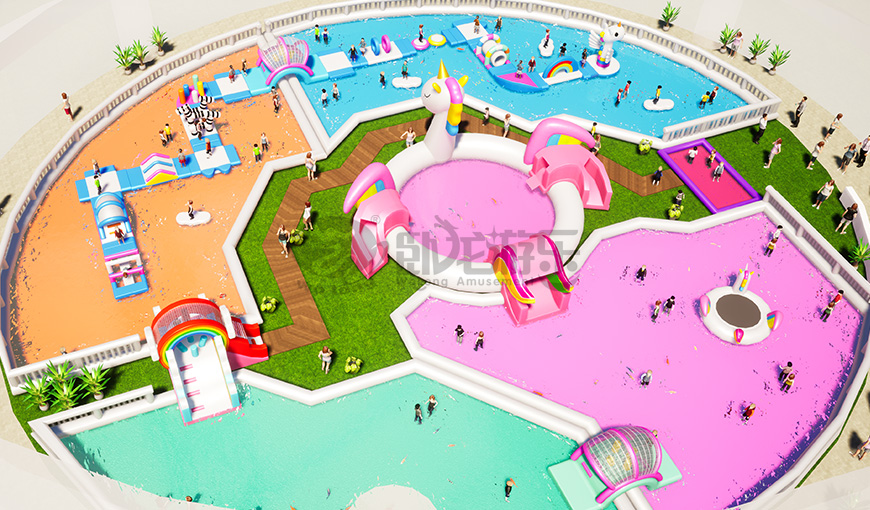 中庭-独角兽彩虹水池是一种专为商场中庭设计的充气水池,结合独角兽主题和彩虹色彩,旨在为购物环境增添趣味性和视觉吸引力。以下是具体信息:
