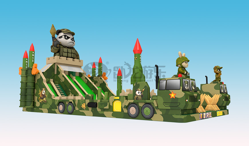 城堡上点缀着军事装备造型的火炮、掩体等元素,搭配可爱的熊猫卡通形象——一只手持火箭筒威风凛凛地站在高处,另一只戴着头盔坐在车上,憨态可掬又不失英气。这种“刚柔并济”的设计,既激发了孩子们的勇气与想象力,又保留了童真的趣味。