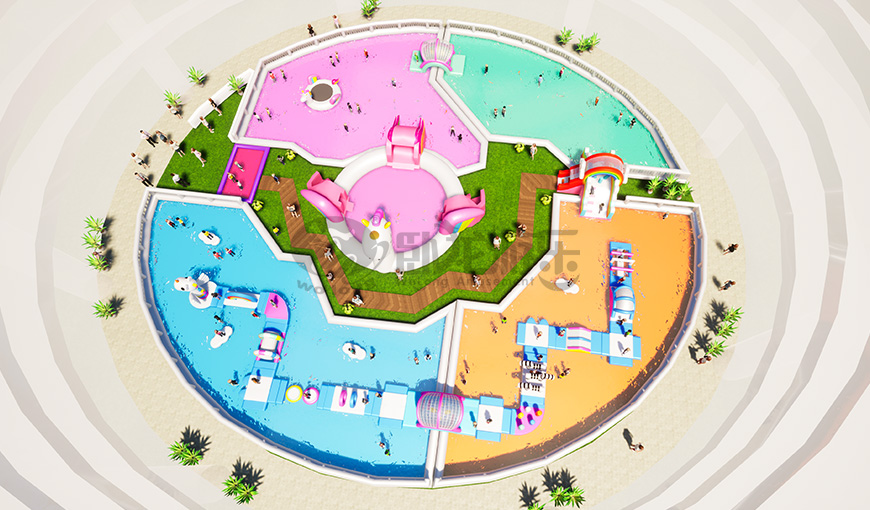 中庭-独角兽彩虹水池是一种专为商场中庭设计的充气水池,结合独角兽主题和彩虹色彩,旨在为购物环境增添趣味性和视觉吸引力。以下是具体信息: